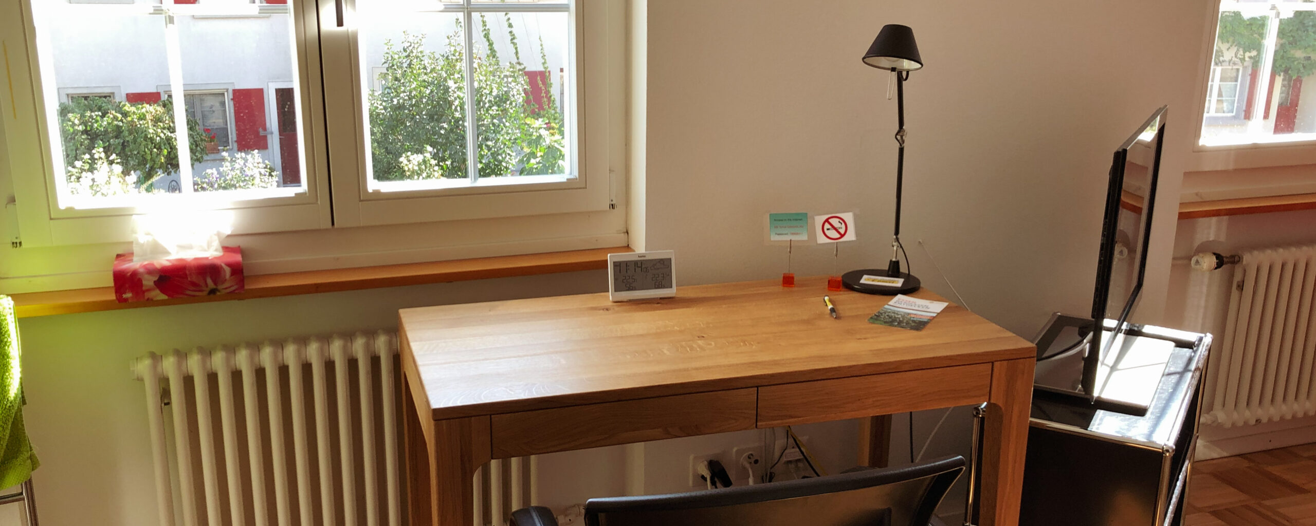 Doppelzimmer mit Gemeinschaftsbad , 2 Einzelbetten, 1 Schlafsofa 120×200 In diesem geräumigen Zimmer mit zwei grossen Fenstern finden bis zu drei Personen sehr gut Platz.  Vorhänge schützen Sie vor fremden Blicken so können Sie konzentriert an einem grossen Tisch arbeiten. Nach der Arbeit können Sie den Abend geniessen auf dem komfortablen Sofa mit Fernsehunterhaltung oder […]